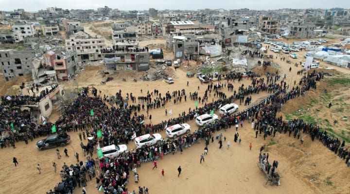 A drone view shows Palestinians and terrorists gathering around Red Cross vehicles on the day Hamas hands over the bodies of deceased Israeli hostages Oded Lifschitz, Shiri Bibas, and her two children Kfir and Ariel Bibas, seized during the deadly Oct. 7, 2023, attack, as part of a ceasefire and hostages-prisoners swap deal between Hamas and Israel, in Khan Younis in the southern Gaza Strip, Feb. 20, 2025. Photo: REUTERS/Stringer